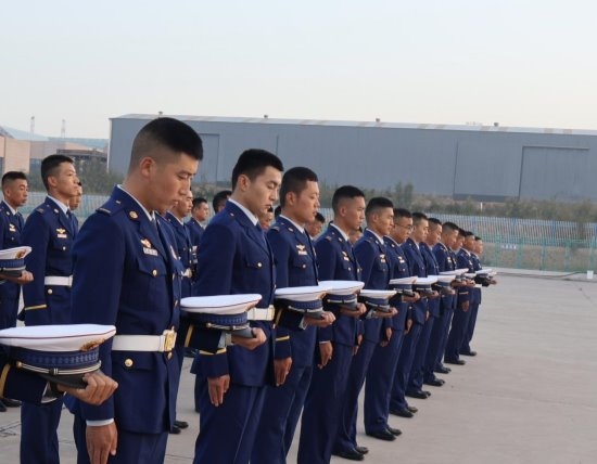 上午10时许,随着防空警报响起,指战员们集体脱帽,肃立默哀,缅怀抗战英烈。在穿越时空的警报下,参与默哀仪式的指战员们庄严肃穆地进行默哀,向在战争中牺牲的革命先烈们致敬,尖厉的声音回荡在辽阔大地,震撼着在场的每一名指战员,警醒着指战员们牢记那段浴血奋战的历史。